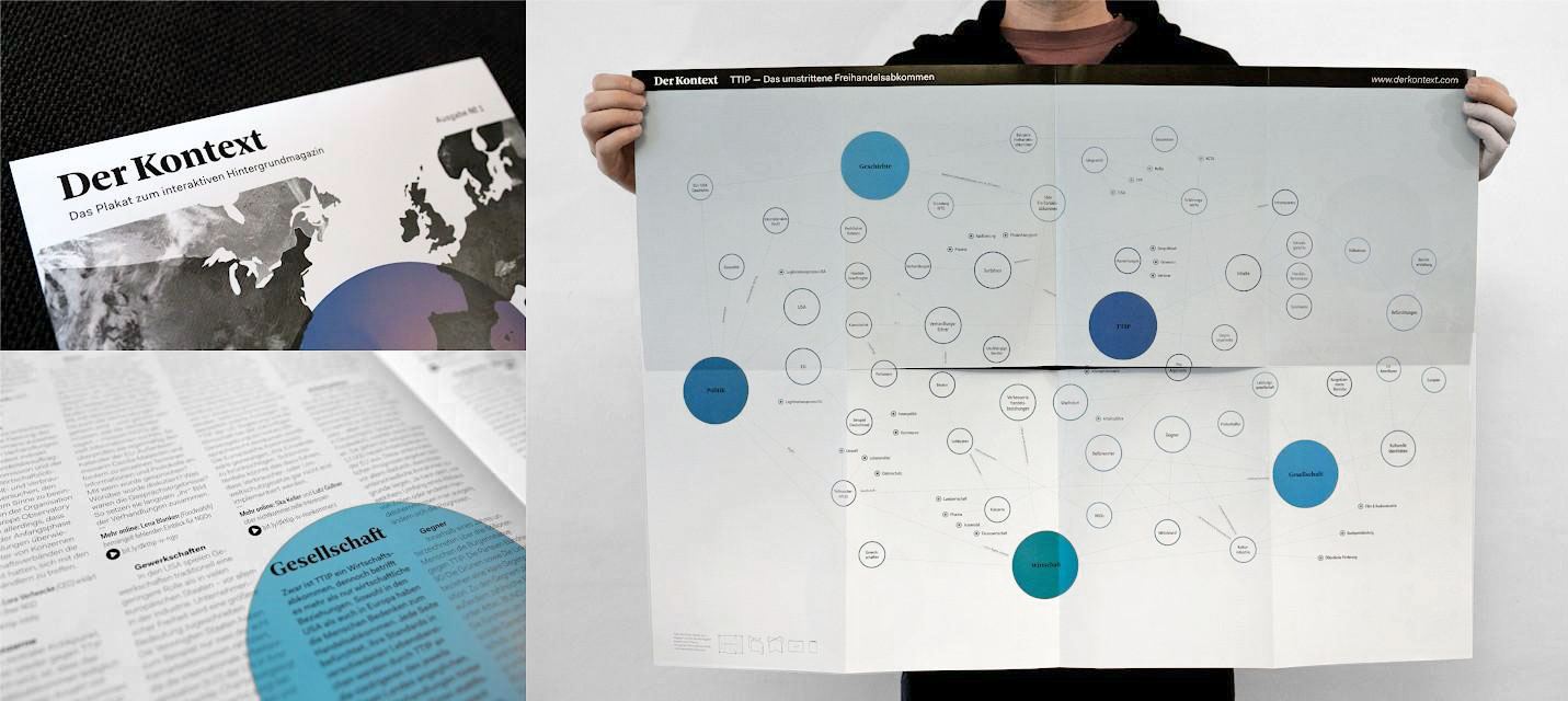 Die Idee ist simpel: Themenspezifische Informationen gesammelt und vernetzt präsentieren. Das Ergebnis ist ein interaktives Hintergrundmagazin, das periodisch online erscheint. Der interessierte Leser registriert sich dafür einfach auf derkontext.com, wird Mitglied und kann sofort loslegen. Von ganz allgemeinen Informationsbereichen wie Politik, Geschichte und Kultur führt das interaktive Interface des Online-Magazins Klick für Klick immer mehr ins Detail. Allein für die erste Ausgabe zum Thema TTIP wurden dabei etliche Texte und Videos, ein paar Dutzend Audio-Dateien und über 120 externe Link-Tipps in die Themenkarte eingearbeitet.