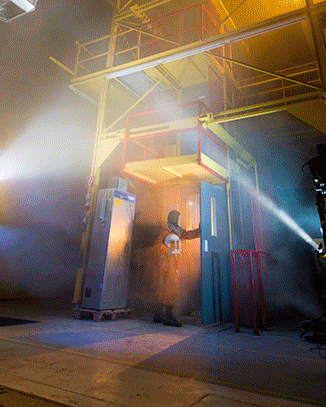 Damit sich der künstliche Nebel nicht gleich wieder verzog, musste das große Hallentor zwischendurch geschlossen und für die Aufnahmen wieder geöffnet werden.